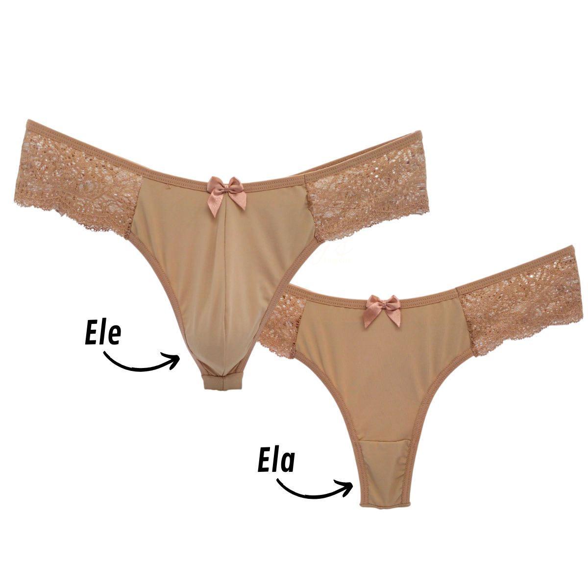 O kit acompanha duas calcinhas fio dental duplo: uma versão masculina e uma feminina, ambas confeccionadas em microfibra e renda.